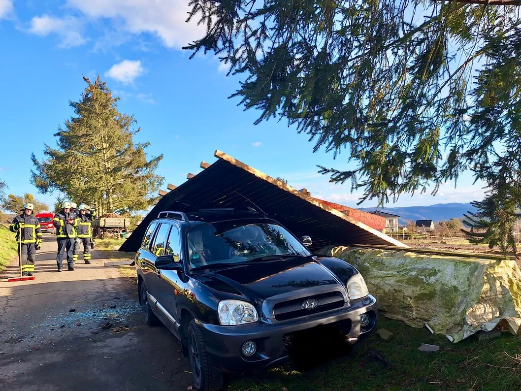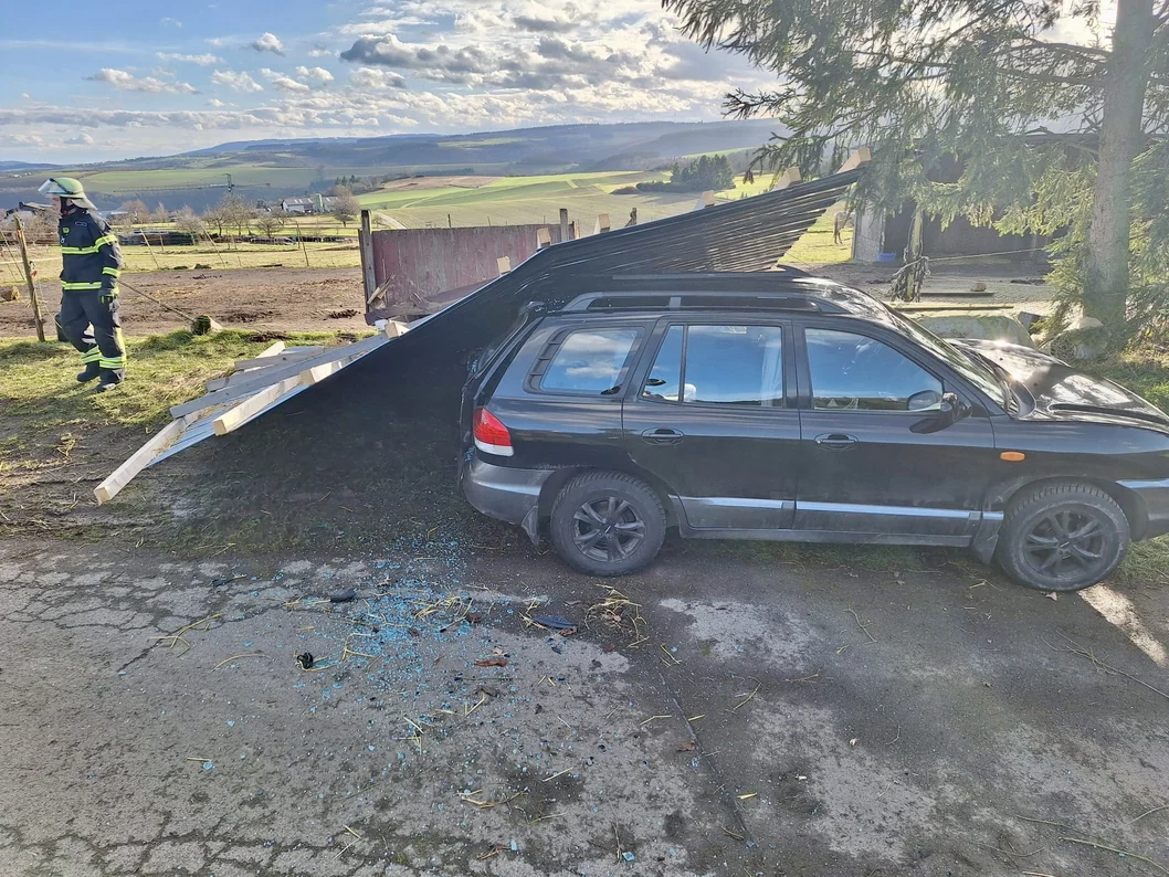 Nach kurzen und heftigen Sturmböen wurde der Unterstand von einer Pferdekoppel meterweit durch die Luft geschleudert und landete auf einem parkenden Auto. Es wurden glücklicherweise keine Personen und Tiere verletzt.